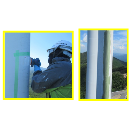 補修箇所への塗装と、さらに前縁部(LE)にはエロージョンから本体を守る保護剤を塗布して作業完了となります。風力発電機を納入した際の当初からブレードに塗布されている保護剤よりも、現在当社で扱っている保護剤のほうがエロージョンに対するダメージや剥がれに強い実績がございます。ぜひ、当社での施工をご検討ください。
